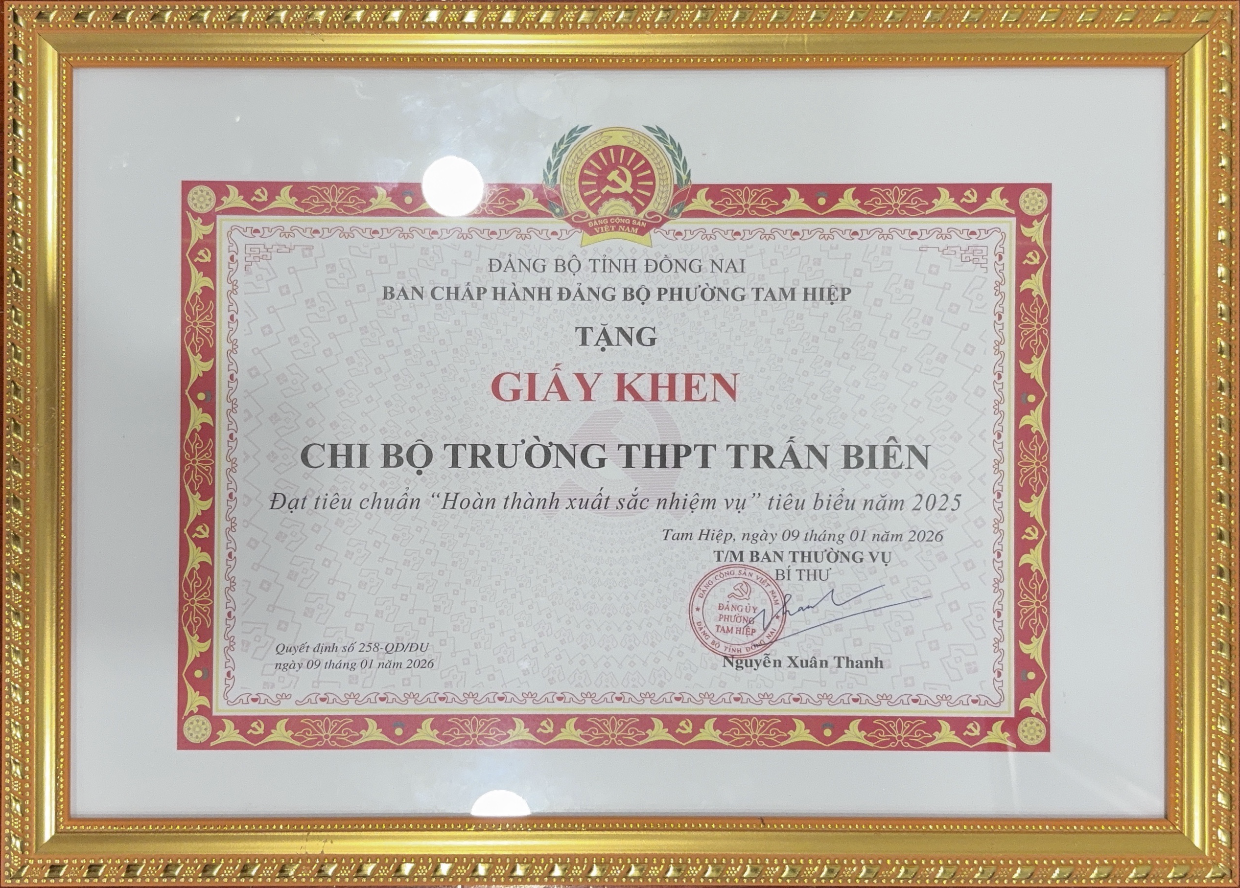 Đặc biệt, năm 2025, Chi bộ Trường THPT Trấn Biên vinh dự được công nhận đạt tiêu chuẩn “Hoàn thành xuất sắc nhiệm vụ tiêu biểu”. Đây là kết quả của quá trình lãnh đạo, chỉ đạo sát sao của Chi ủy, sự đoàn kết, thống nhất cao trong Chi bộ, cũng như tinh thần trách nhiệm, ý thức tự giác, nỗ lực không ngừng của từng đảng viên. Thành tích này khẳng định vai trò hạt nhân chính trị của Chi bộ trong nhà trường, đồng thời thể hiện rõ hiệu quả của việc gắn công tác xây dựng Đảng với nhiệm vụ chuyên môn, xây dựng đội ngũ nhà giáo vững vàng về tư tưởng, giỏi về chuyên môn, mẫu mực về đạo đức.