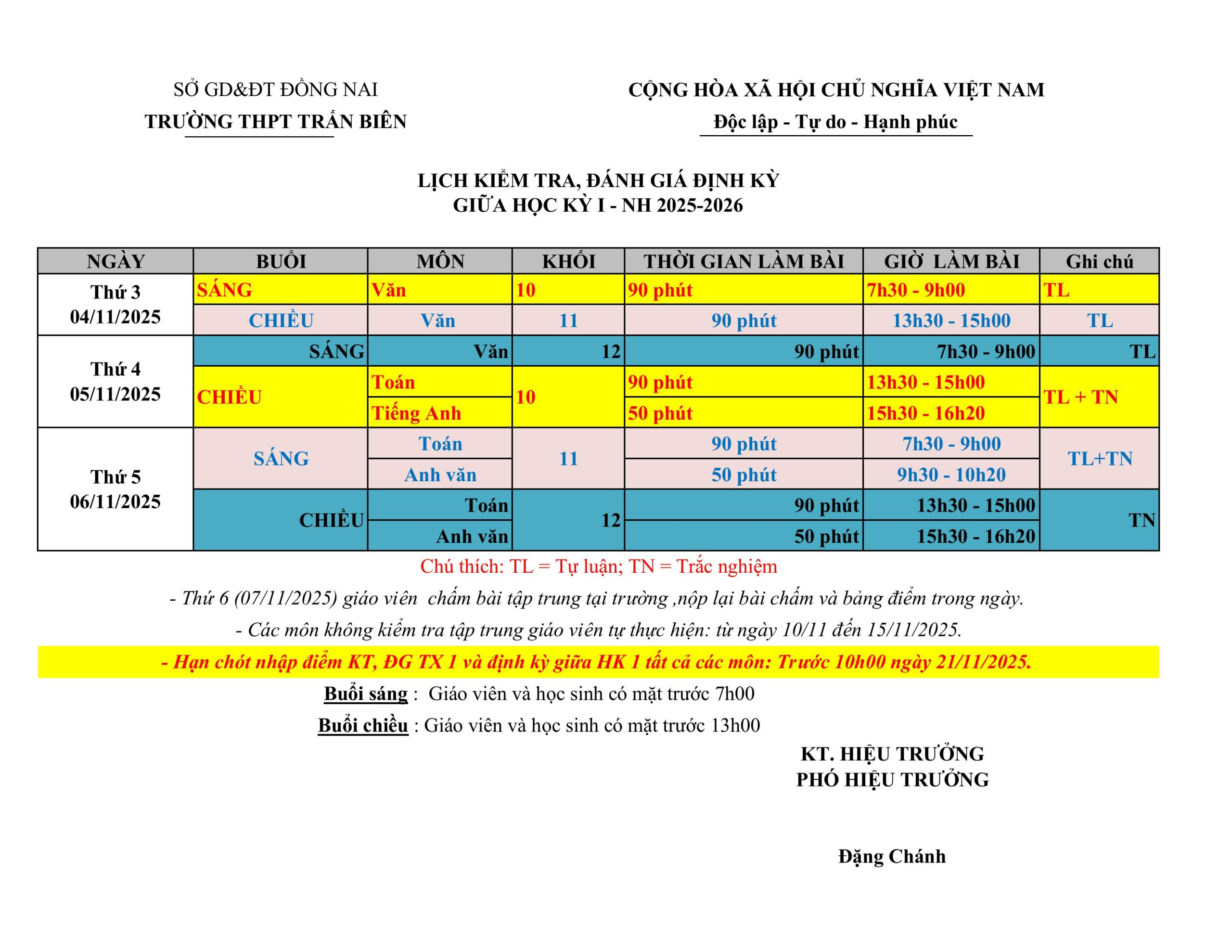 NHÀ TRƯỜNGTHÔNG BÁO - KẾ HOẠCH Kỳ kiểm tra, đánh giá định kỳ giữa học kỳ I năm học 2025 – 2026 By Mạnh Nguyễn - 27/10/2025 0 1354 Share FacebookTwitterPinterestWhatsApp I. LỊCH KIỂM TRA, ĐÁNH GIÁ CHI TIẾT: Xem tại đây II. SỐ BÁO DANH, PHÒNG THI Khối 10 Khối 11 Khối 12 III. SƠ ĐỒ PHÒNG THI IV. MẪU PHIẾU TRẮC NGHIỆM VÀ HƯỚNG DẪN SỬ DỤNG V. PHÂN CÔNG COI THI Xem tại đây