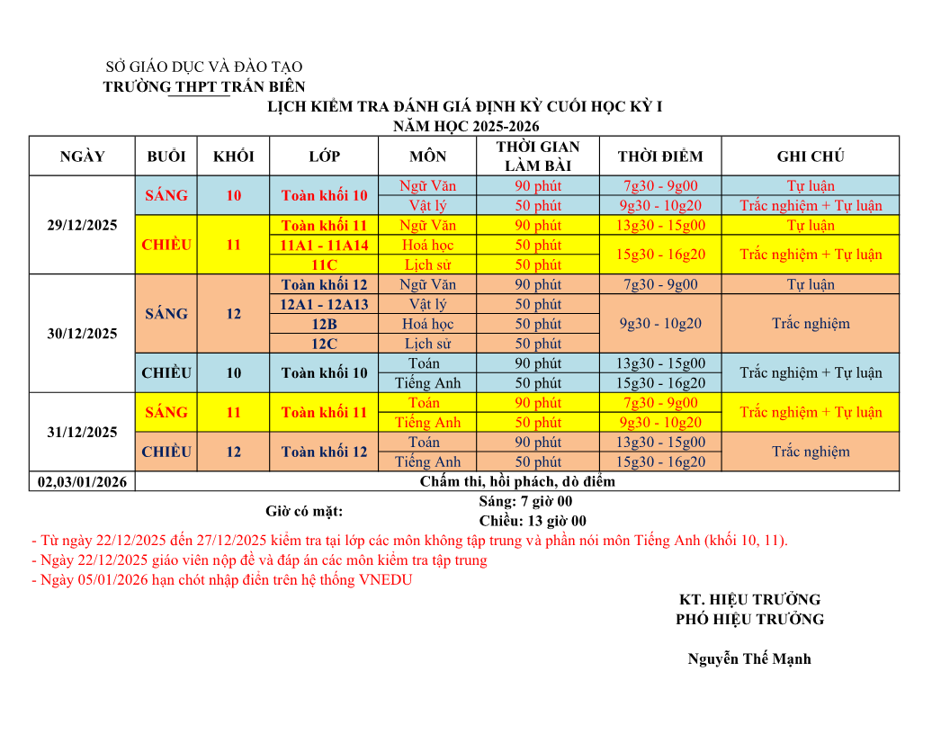 NHÀ TRƯỜNGTHÔNG BÁO - KẾ HOẠCH Lịch kiểm tra, đánh giá định kỳ cuối HK 1 – NH 2005-2026 By Mạnh Nguyễn - 14/12/2025 0 1818 Share FacebookTwitterPinterestWhatsApp I. Lịch chi tiết II. Số báo danh các môn KT, ĐG tập trung Khối 10 Khối 11 Khối 12 III. Sơ đồ phòng thi IV. MẪU PHIẾU TRẢ LỜI TRẮC NGHIỆM V. PHÂN CÔNG COI THI Đang cập nhật